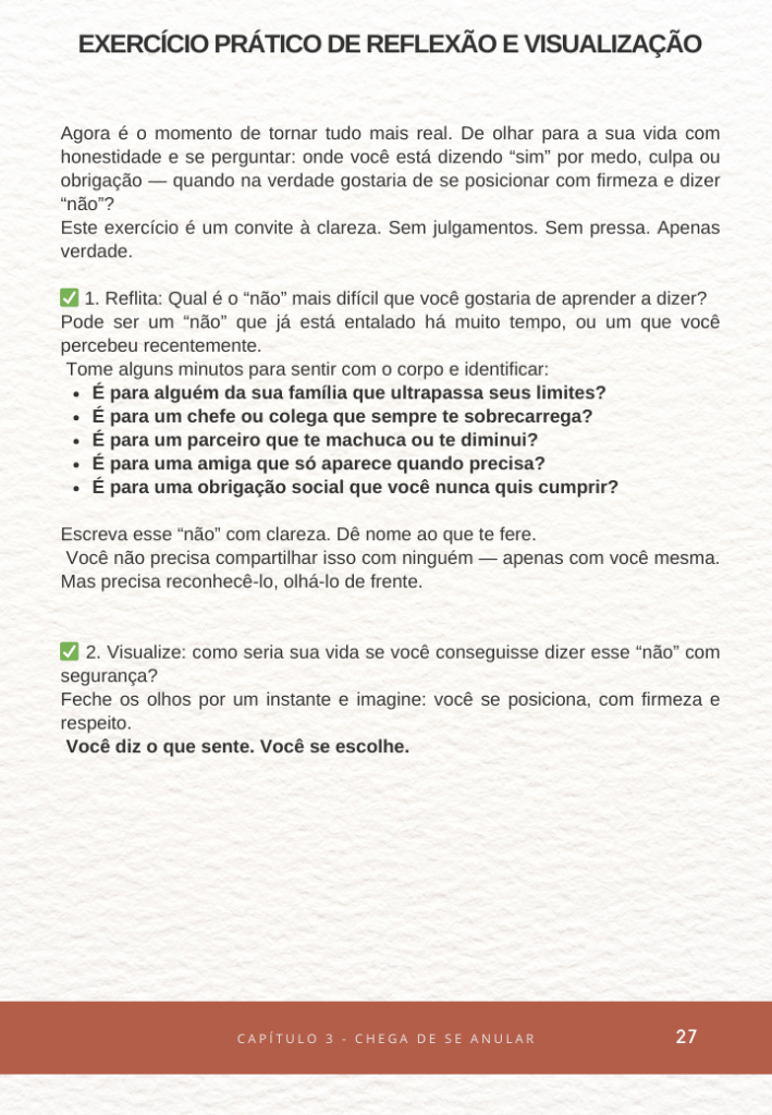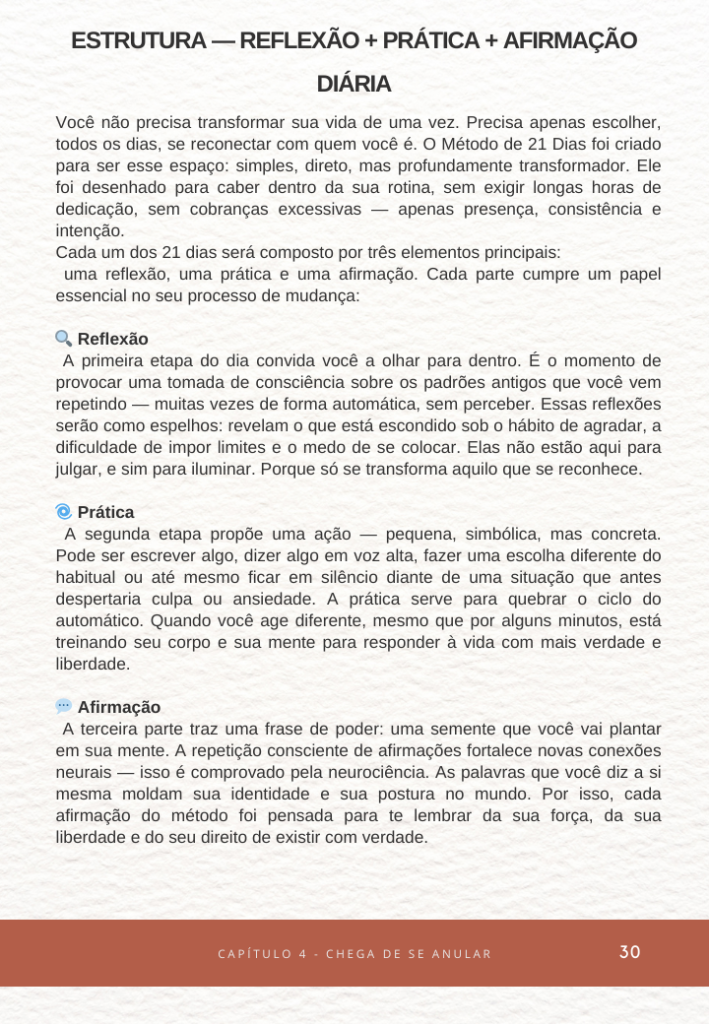 A cada semana, você vai encontrar perguntas de reflexão, espaços para anotar suas percepções, pequenas tarefas e lembretes motivacionais que te ajudam a manter o foco e enxergar sua evolução real.